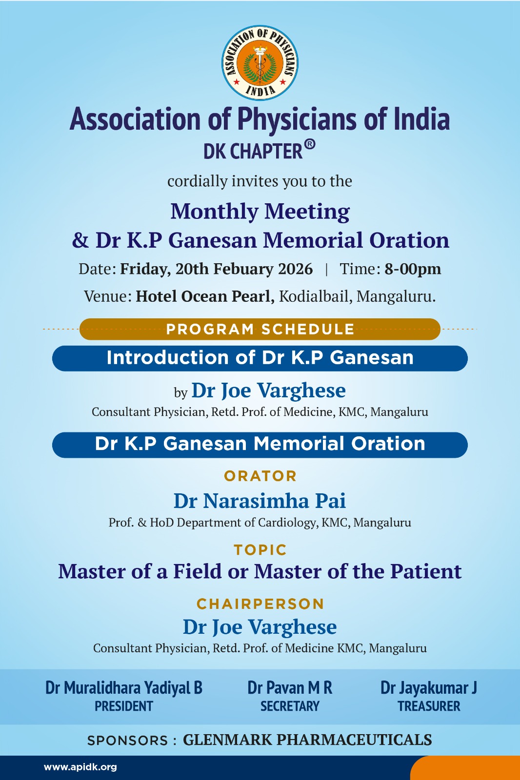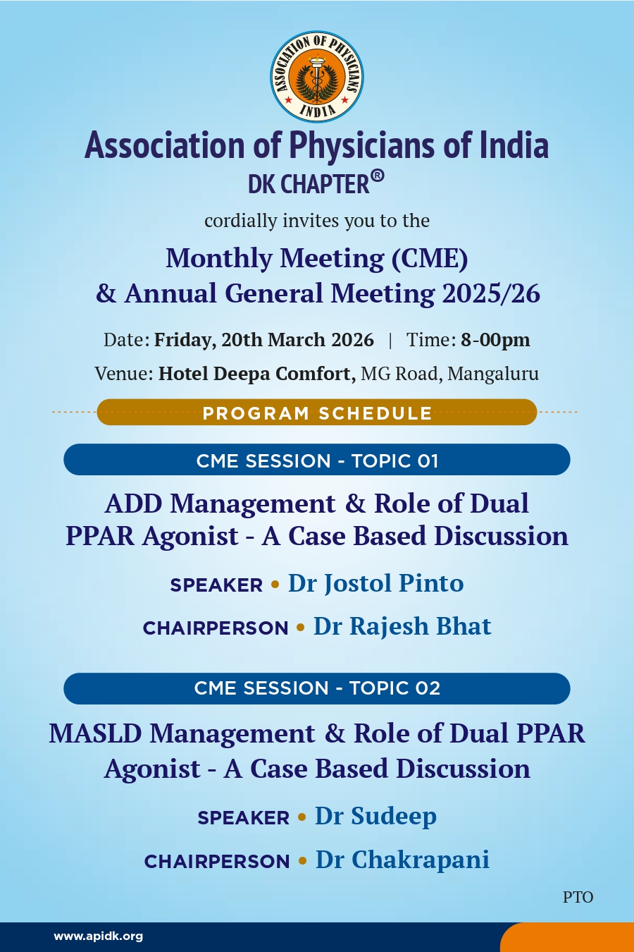 Topic: Guidance in the evaluation & Management of Dengue Fever - Evidence Based Approach Association of Physicians of India (DK Chapter) cordially invites you for the MONSOON CME (Virtual Mode) Date- 29th July,Saturday Time- 3.00 pm Scientific Agenda - Topic 1- Guidance in the evaluation and Management of Dengue Fever- Evidence Based Approach Dr Chakrapani.M MD Senior Consultant & Professor of Medicine,KMC Mangalore Topic 2-Diagnosis and Management of complicated and uncomplicated Malaria Speaker - Dr.V.K .Vineeth MD FNB (Infectious Disease) Infectious Disease Consultant, Yenepoya Medical College, Mangalore Chair persons- Dr.Roshan M MD Professor & HOD , Department of Medicine Father Muller Medical College, Mangalore Dr.Balachandra A Shetty MD Professor & HOD , Department of Medicine A.J Institute of Medical Sciences,Mangalore Moderator - Dr.Archana Bhat Professor, Department of Medicine Father Muller Medical College, Mangalore Dr.Haroon.H MD Consultant -Internal Medicine KMC Hospital, Mangaluru To join the meeting,Click https://manipalhospitals.zoom.us/j/98177923399?pwd=RFAvY0NkbkdQZERiTm5BYjVCM2UwZz09#success RSVP: Dhruv Kulai -9108233978 Digital Support by KMC Hospital,Mangaluru the CME is open for doctors from all specialities. kindly encourage PG students and interns to join and make the best use of the CME.
