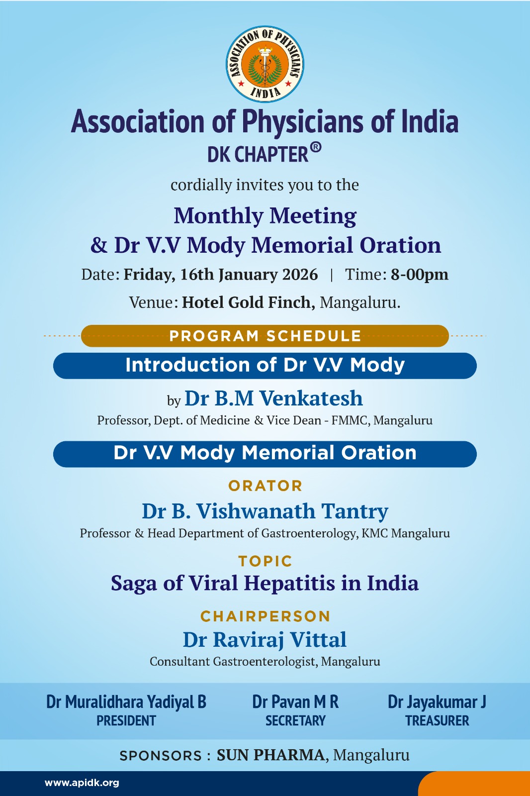 The website www.apidk.org was launched on 19.06.2020 at Father Muller Medical College Hospital by Dr.BH Krishnamoorthy Rao, founder President of API, DK Chapter at 3 pm. Dr.B H Krishnamoorthy Rao spoke on the initial days in 1991 when the association was established with only 40 members and now it has grown to 160 members. Rev.Fr.Ajith Menezes, Administrator, FMMC was the guest of honour. He spoke on use of technology in the present COVID Era and importance of virtual meet. Dr.H.Prabhakar, Interventional Cardiologist, Father Muller Medical College, former President of API DK Chapter spoke on the importance of website for API DK Chapter to foster communication among its members. Guest speaker Mr.Gerard Colaco spoke on effective personal investments in Covid Era. The function was presided by Dr.Venkatesha BM, President,API DK Chapter. Vote of thanks was given by Dr.Mohammed Ashraf, Treasurer. Introductory note and insight into the website was given by Dr.Archana Bhat, Secretary, API, DK Chapter. The programme was live telecasted on youtube, was viewed by more than 150 participants.
